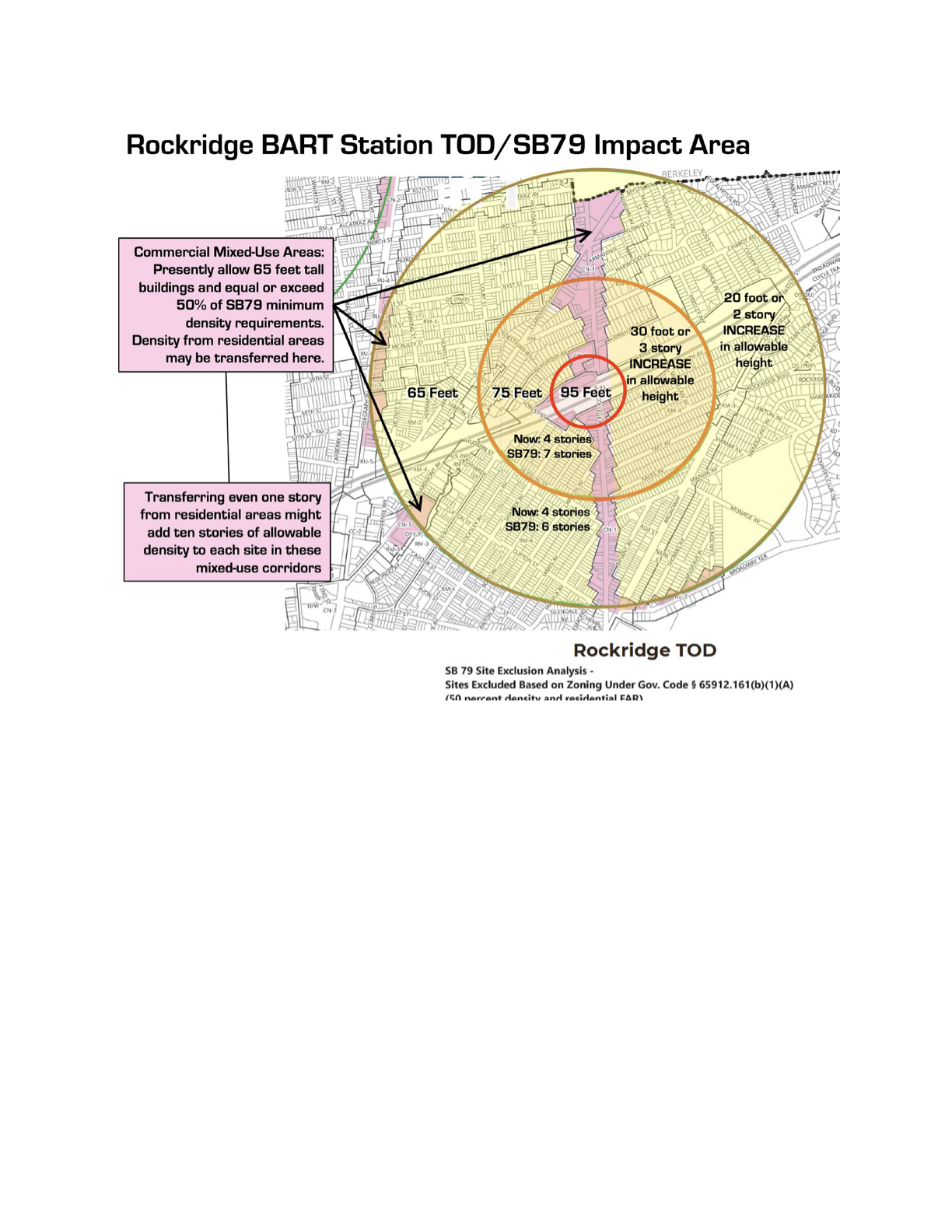 Oakland has eight BART Stations and 38 Bus Rapid Transit (BRT) stops that are affected. The law allows housing to be built on any property within a half mile of a transit stop. For heavy rail stations, like Rockridge BART, height limits are increased to 95 feet (nine stories) within 200 feet of the station entrance, to 75 feet (seven stories) within ¼ mile and to 65 feet (six stories) within ½ mile.