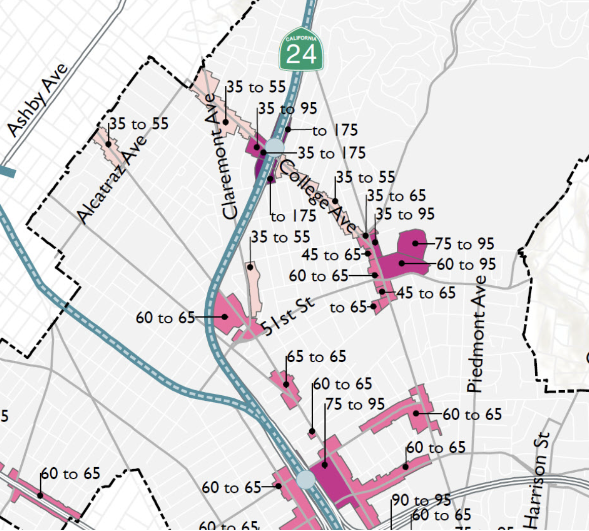 Maximum commercial building heights in Rockridge locations will be higher in the proposed zoning. College Ave. building heights will increase from the current 35 to 55 ft. The newly rezoned BART station maximum height will be 175 ft. At an April 13, 5:30pm meeting on TOD development at the Rockridge BART, the community’s input will be solicited. Updates will be available on rockridge.org.