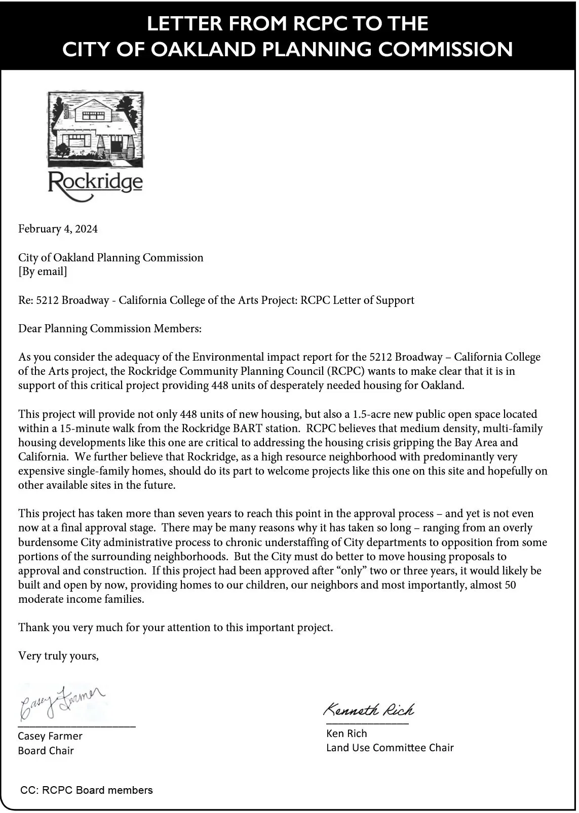 The Rockridge Community Planning Council (RCPC) recently sent the letter below regarding the proposed “CCA Project” at 5212 Broadway to both the Oakland Planning Commission and the Landmarks Preservation Advisory Board on the occasion of hearings regarding the project in front of both those bodies.